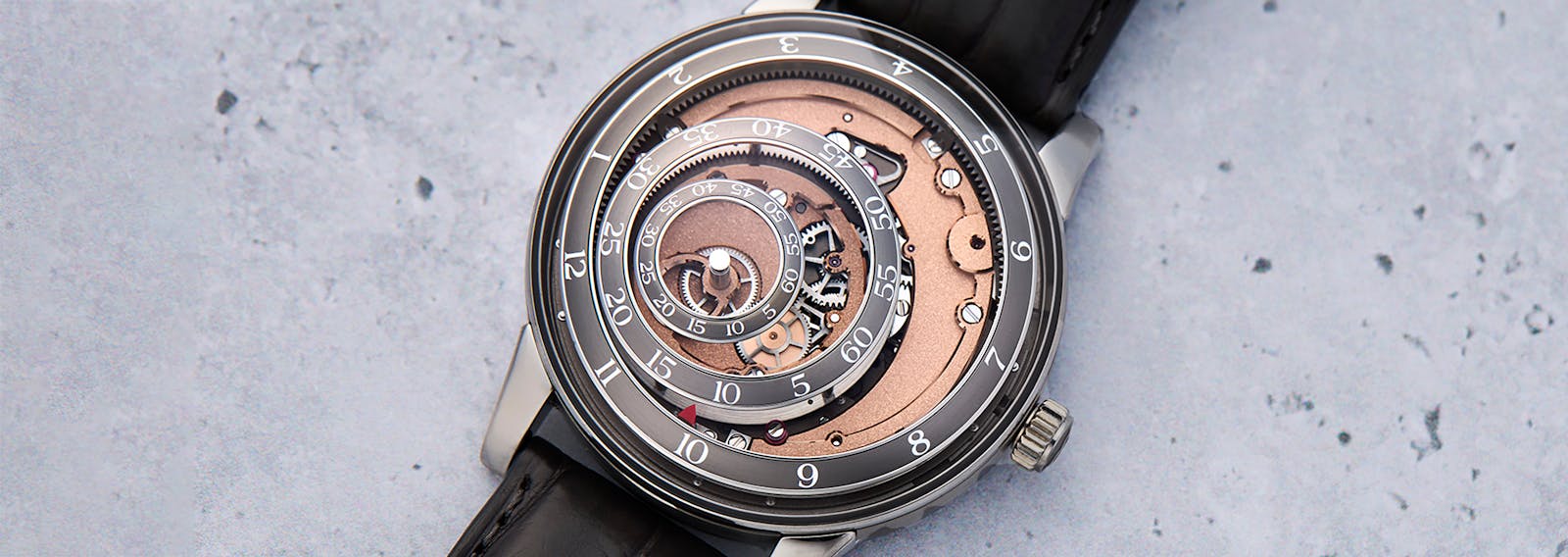The system was originally developed as a module on an ETA 2892  by Jean-François Mojon of Chronode, for Trilobe’s first watch, Les Matinaux, but in 2020, Trilobe introduced a new movement, the X-Center (a pun on “eccentric,” referring to the eccentric arrangement of the time rings) which was developed in partnership with Le Cercles des Horlogers, in La Chaux-de-Fonds.