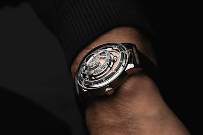 Typically in Trilobe watches, the rings are set flat on the dial but for 2022, Trilobe launched a watch in which the rings are separated vertically, inside a deeply domed sapphire crystal: La Folle Journée – approximately, “crazy day” in French. In keeping with Trilobe’s habit of naming its watches after works of art and literature, the name is derived from the title of the play, La Folle Journée ou le Mariage de Figaro by Pierre Augustin Caron de Beaumarchais.