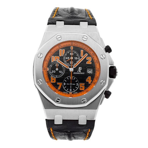 The flow from black dial to orange rehaut to brushed stainless steel to the two-tone hornback alligator strap keeps visual appeal intense and expresses the striking forms of the Offshore case with force.