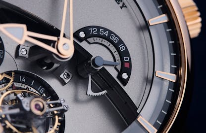 The dial side of the watch is organized into two levels, with the lower level housing the inclined tourbillon and running seconds subdial, and the upper containing the power reserve indication. The movement is driven by two fast rotating barrels, coaxially stacked, with a 72 hour power reserve; one of the barrels has an automatic movement-type slipping bridle, to prevent excessive torque.